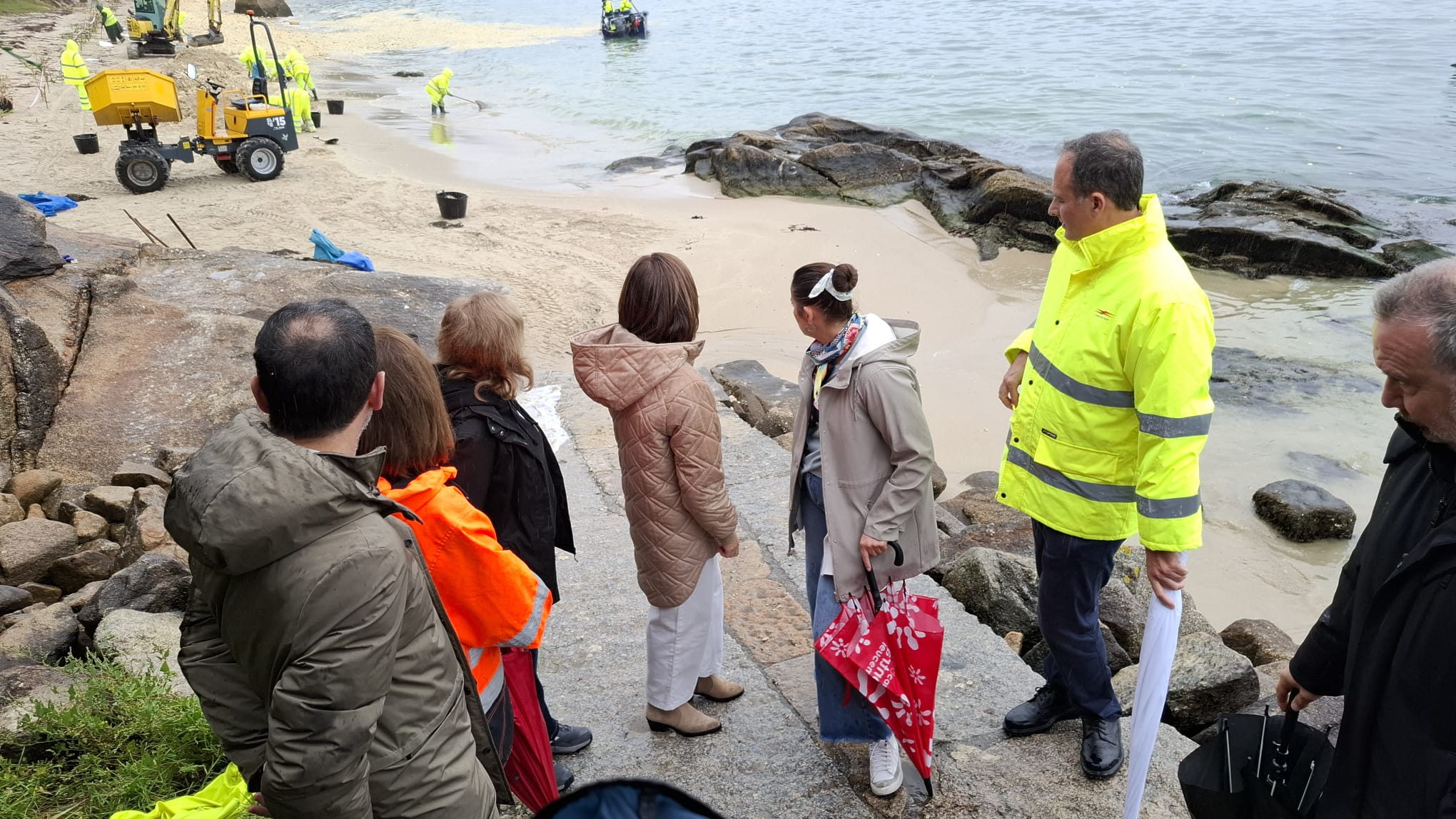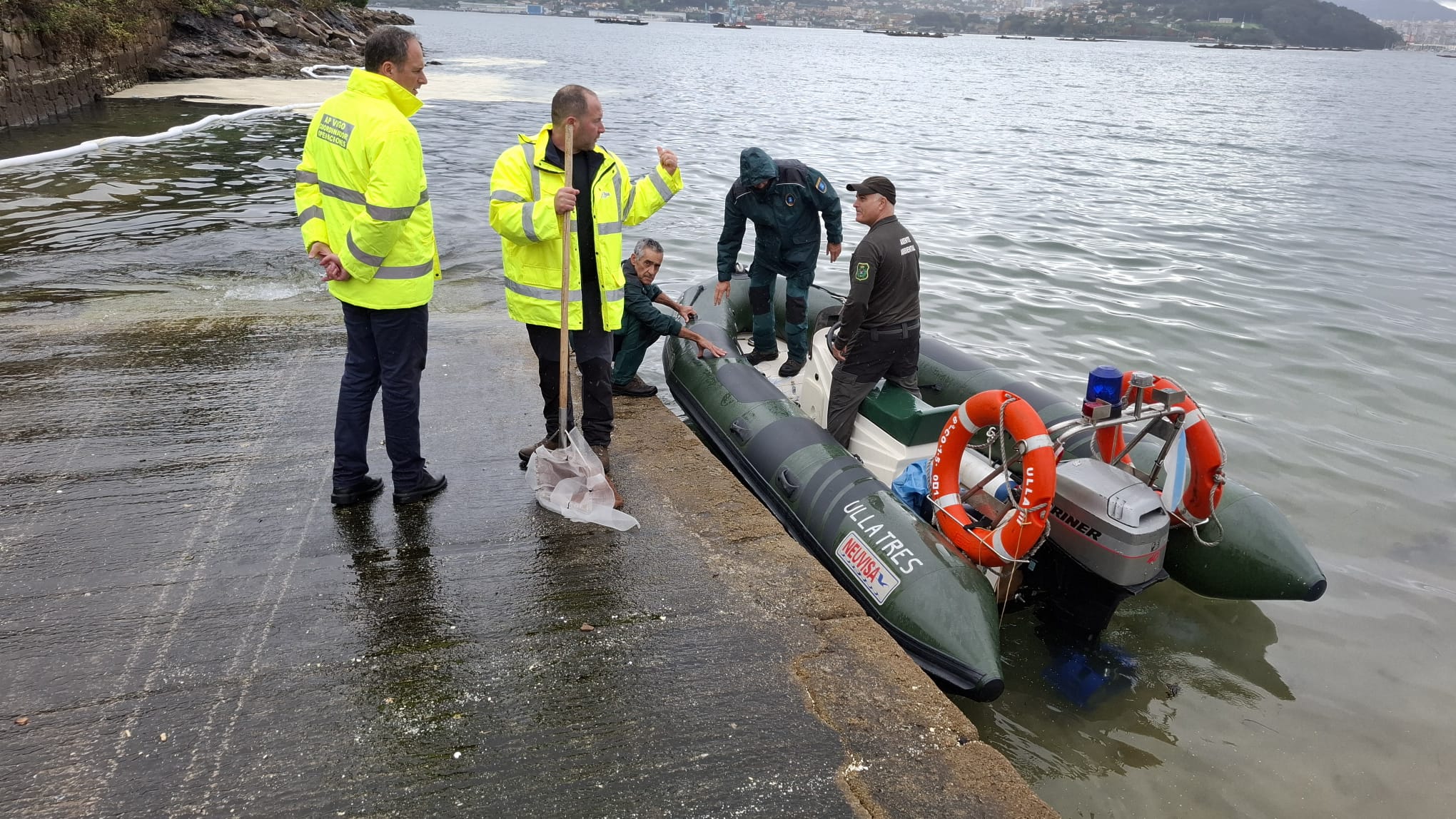 Tras su intervención, el máximo responsable portuario, que ha seguido muy de cerca el incidente desde su inicio, tanto a pie de muelle como desde el centro de control, está recorriendo los diferentes escenarios del vertido y, en este momento, se encuentra en las inmediaciones de la playa de A Borna, en Moaña junto a la alcaldesa del municipio, Leticia Santos, y la conselleira de Medio Ambiente, Ángeles Vázquez.
