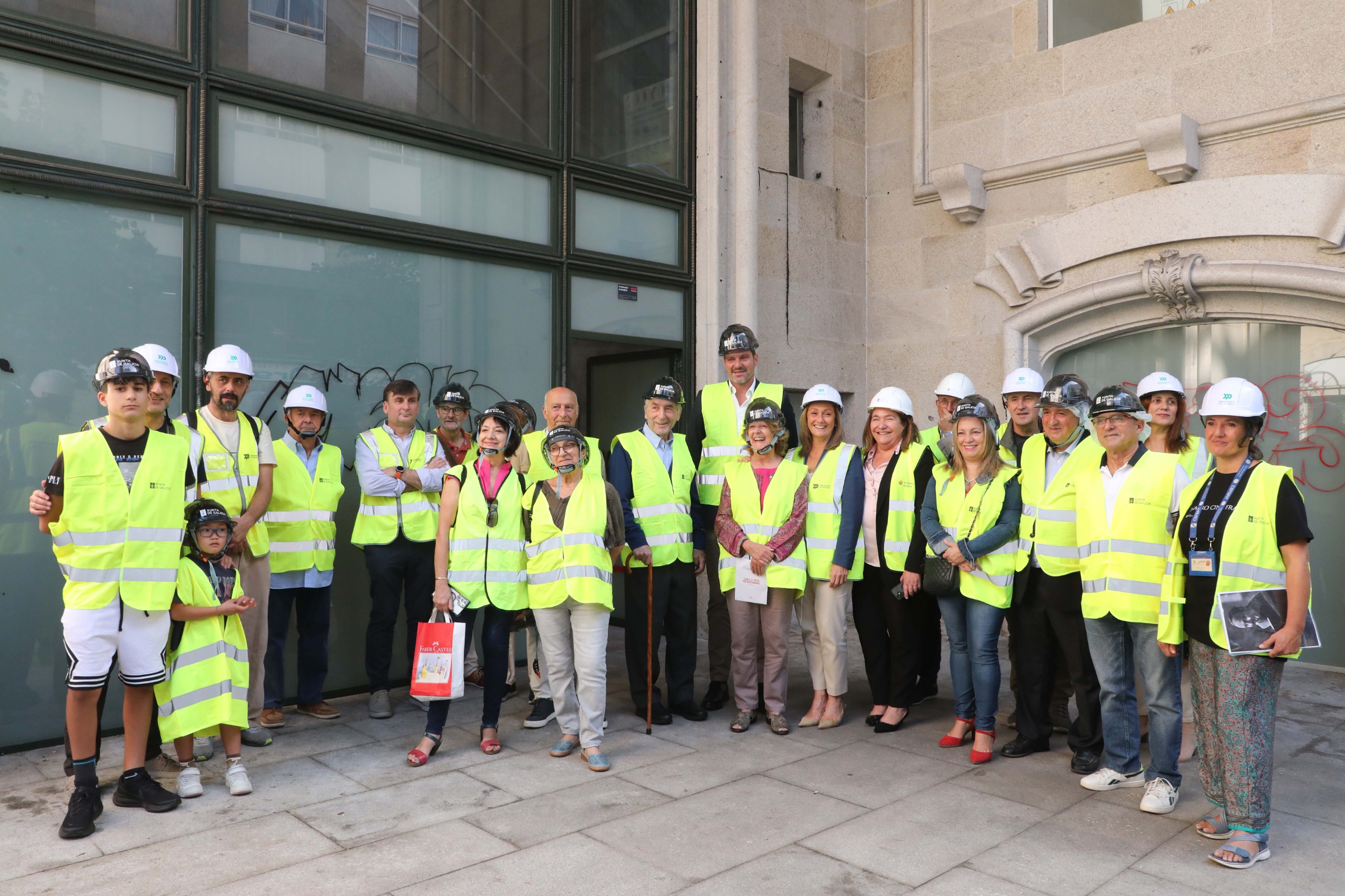 As quince persoas inscritas na primeira quenda desta xornada inaugural visitaron o edificio acompañadas das explicacións ofrecidas por unha guía titulada. Percorreron desde a fachada ata o vestíbulo principal do edificio, con parada na escaleira de acceso ao segundo andar, que permite ter unha visión da parte superior do inmoble, para concluír na platea.