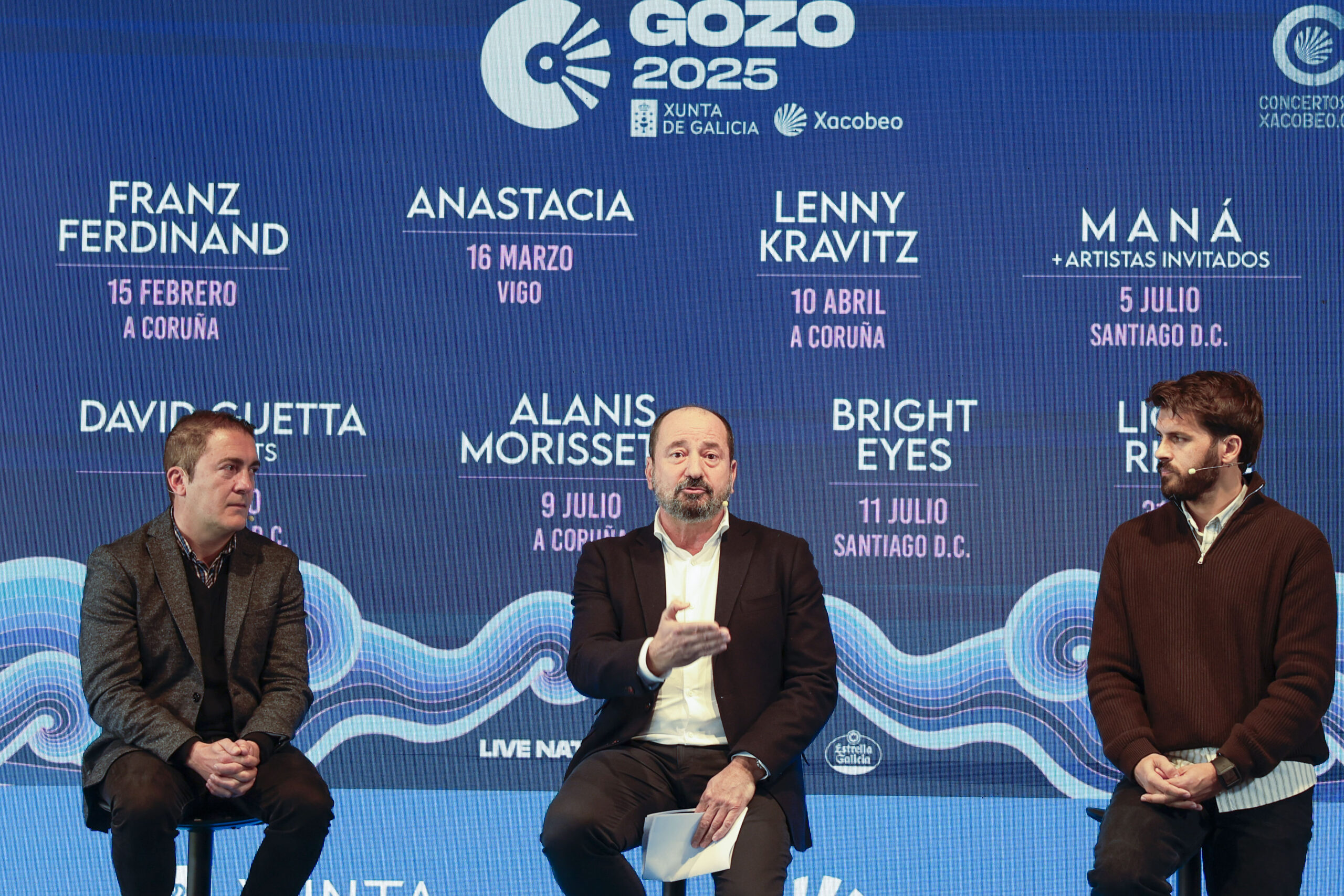SANTIAGO DE COMPOSTELA, 27/02/2025.- El director de Turismo de Galicia, Xosé Merelles, (c) posa con el organizador, David Lago "Tibe" (izq) y el representante del patrocinador, Estrella Galicia, Juan Martínez durante la presentación de la nueva edición del Gozo Festival, hoy jueves en Santiago de Compostela.