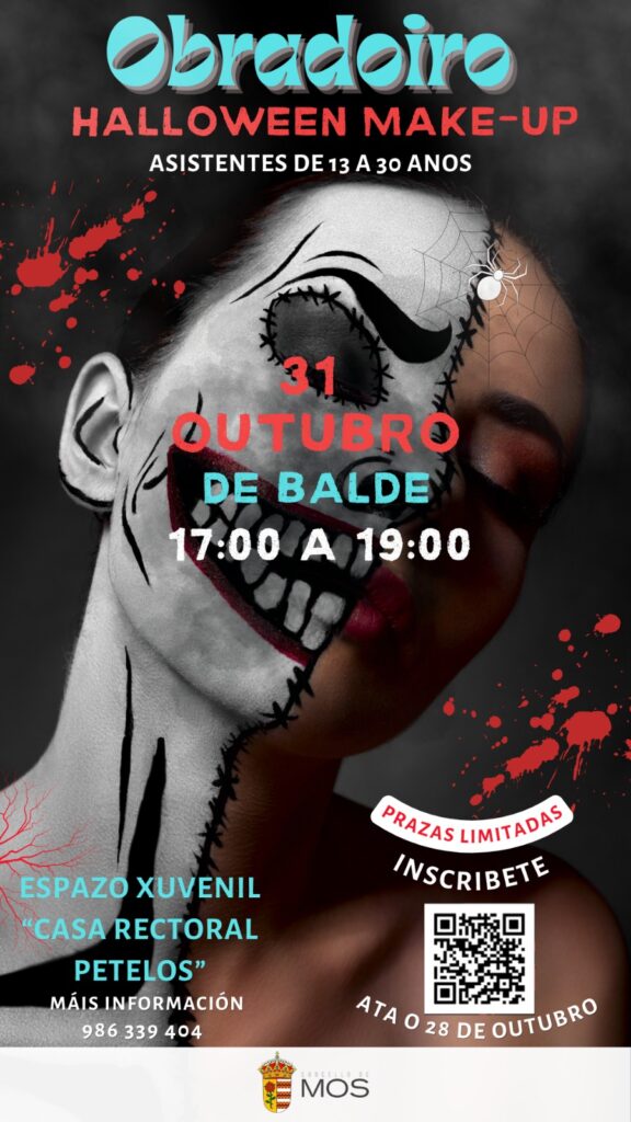 Ademais, pensando na mocidade, o Concello de Mos propón o Obradoiro de balde “Halloween Make-Up”, unha actividade dirixida á rapazada maior de 13 anos que se celebrará o 31 de outubro, de 17:00 a 19:00 horas, no Espazo Xuvenil Casa Reitoral de Petelos. As inscricións están abertas ata o 28 de outubro.